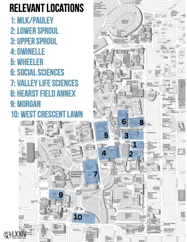 Note: West Crescent Lawn is located on the western edge of the UC Berkeley campus near the intersection of Center and Oxford Street, walking route pictured below:
